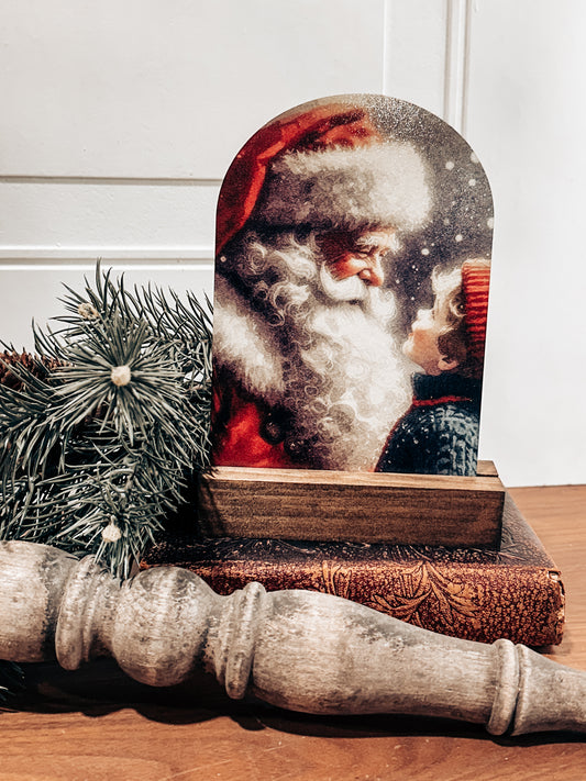 Vintage Santa & Child Wood Block — Classic Christmas Table Décor