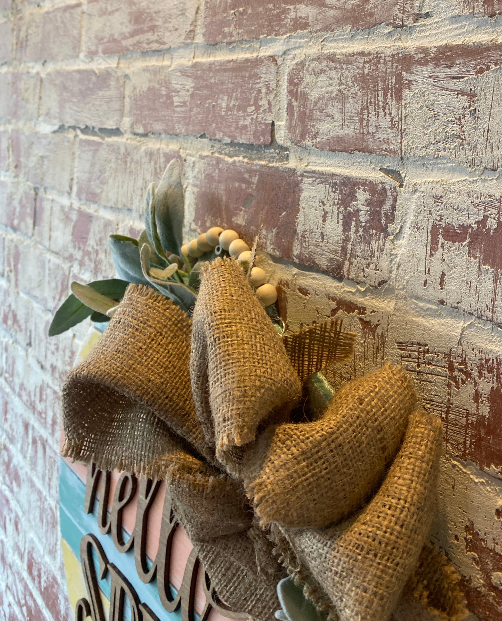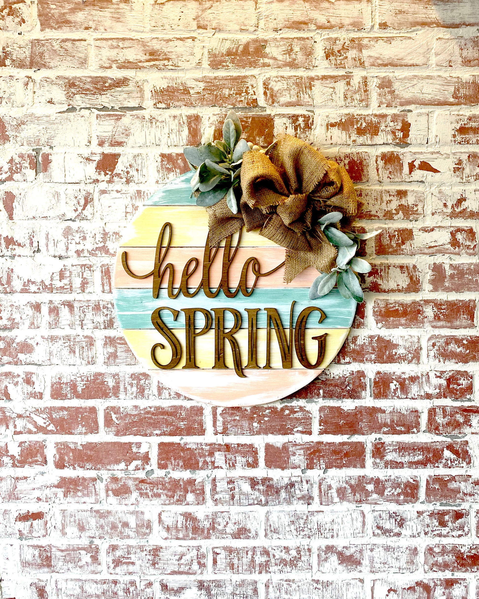 Faux shiplap and pastel colors make this door hanger a warm spring welcome to all of your guests.