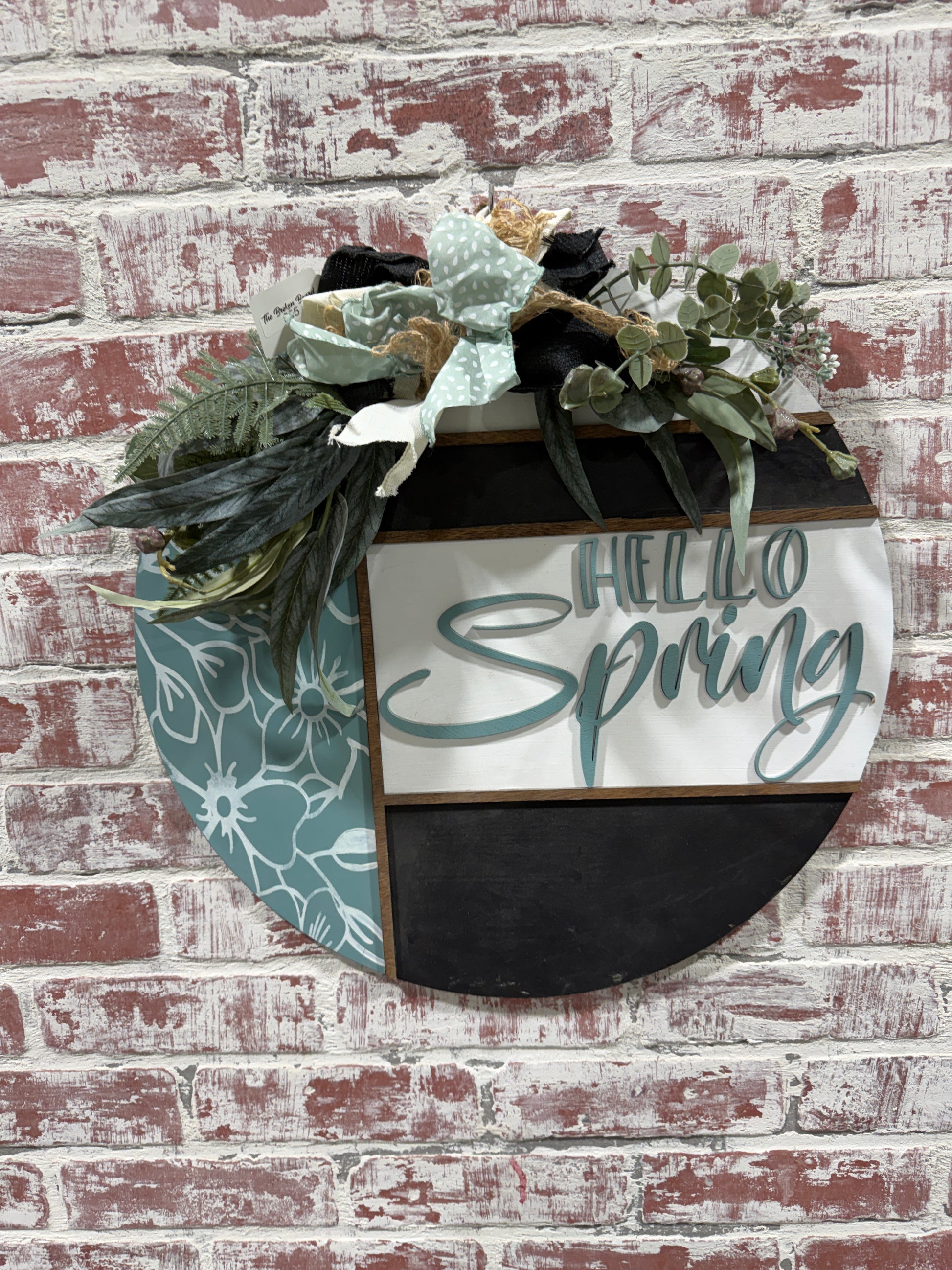 Welcome the season with this charming spring door hanger that brings warmth to your entryway. Crafted in a boho-farmhouse aesthetic, it features a striking teal and black palette accented with crisp white details. Delicate floral ribbon and lush greenery create an inviting, nature-inspired look that celebrates the renewal of spring. Perfect for adding handcrafted character to your home or gifting to someone special.