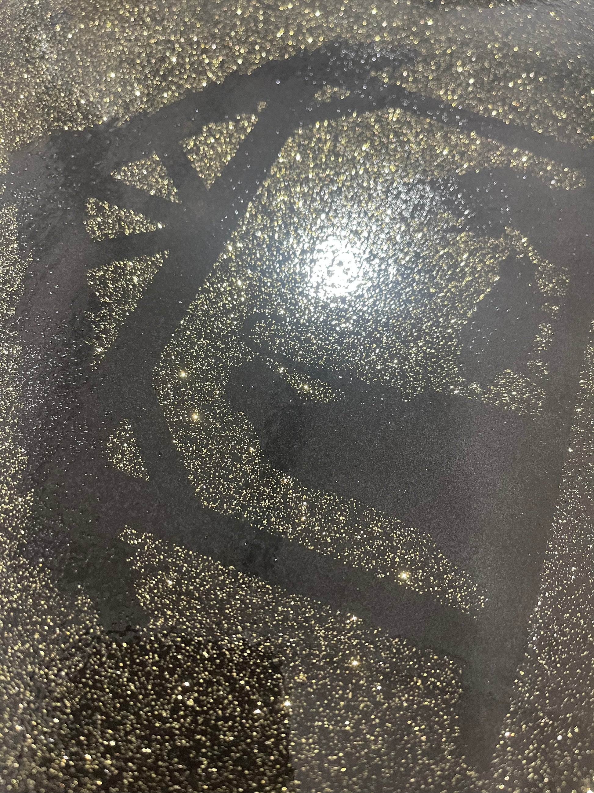 O holy night door hanger with silhouette of a simple nativity scene. This piece is a favorite of mine. The background is black with gold glitter overlaying the nativity and the “O holy Night”. Is a simple elegant gold color. This piece is 18” in diameter and 1/4” thick. The door hanger will come with a ribbon attached to the back for ease of hanging once you receive your item.