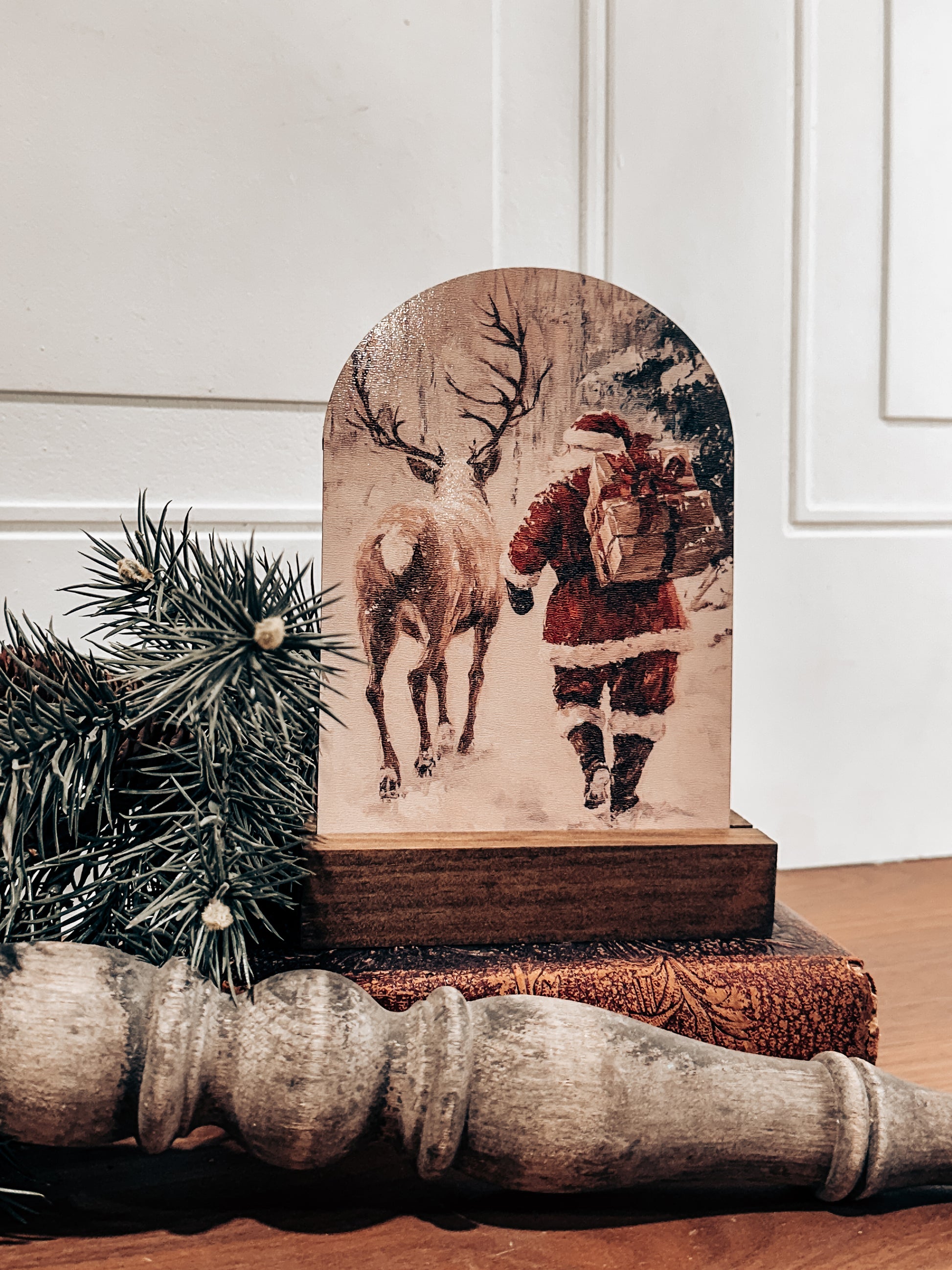 Rustic Santa & Reindeer Wood Block — Vintage Christmas Déc